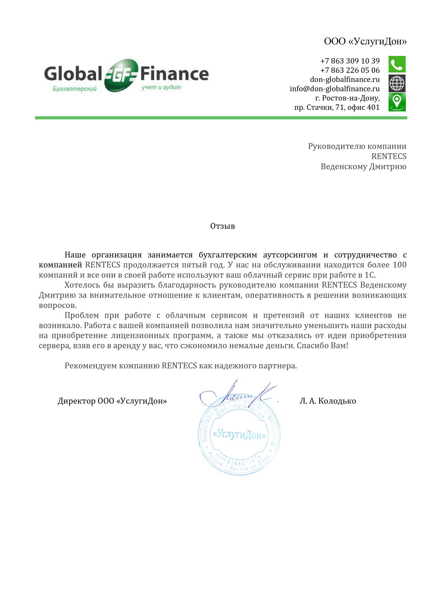 Впервые воспользовалась облачным сервисом, и это очень интересно. Возможность за разумные деньги переложить обслуживание 1C и данных на владельцев сервиса очень удобна. Не нужно самостоятельно заниматься обновлением баз 1С, антивирусной защитой. Есть уверенность, что с данными ничего не случится. А если возникают сложности, сотрудники rentecs оказывают быструю и качественную техническую помощь.